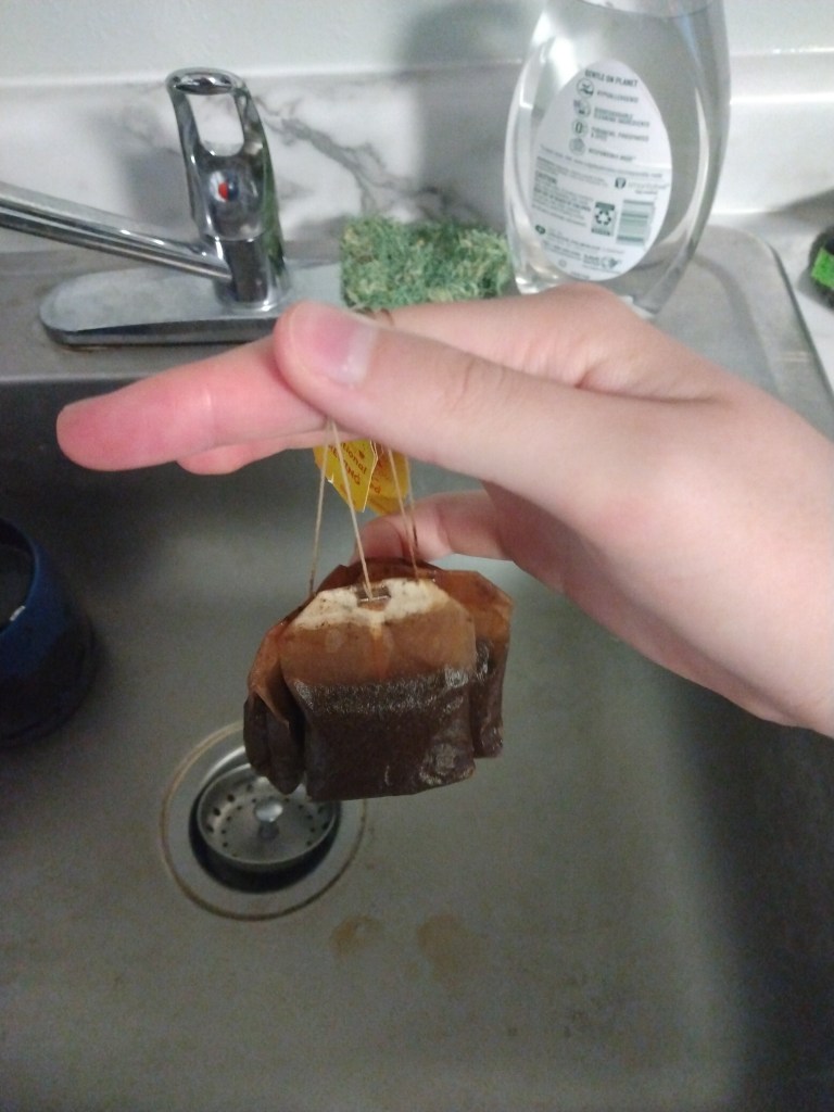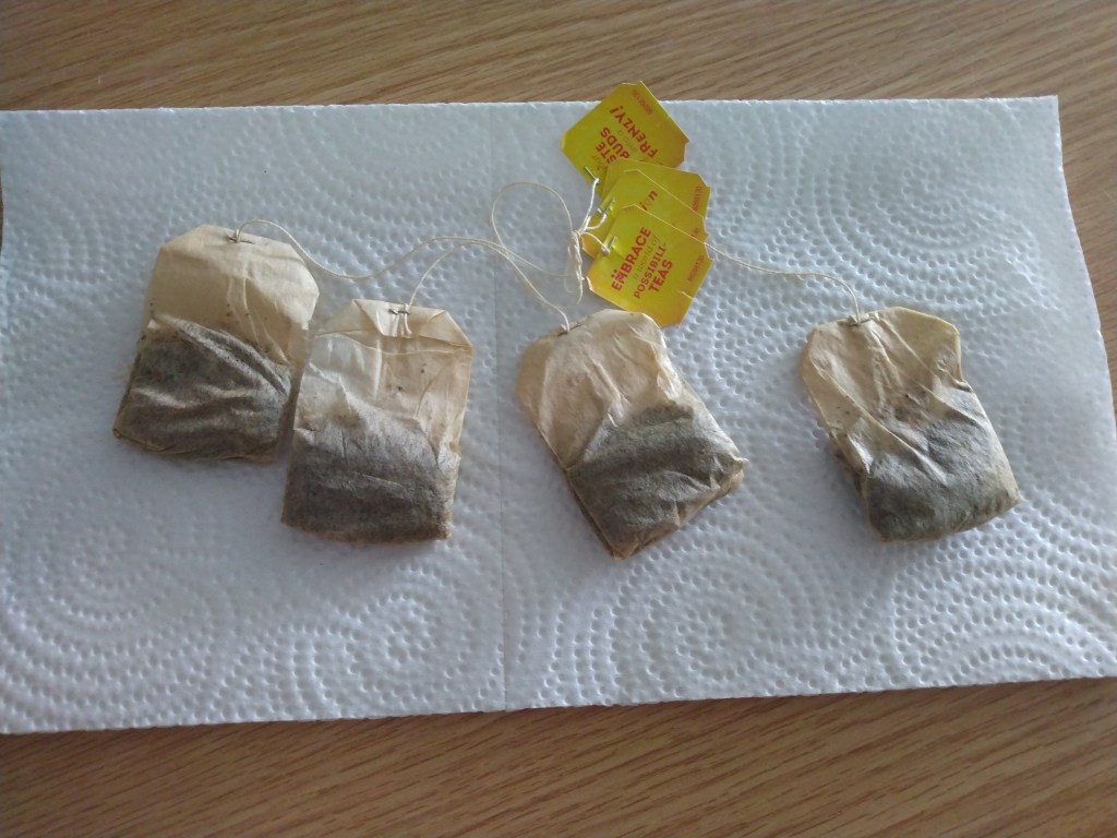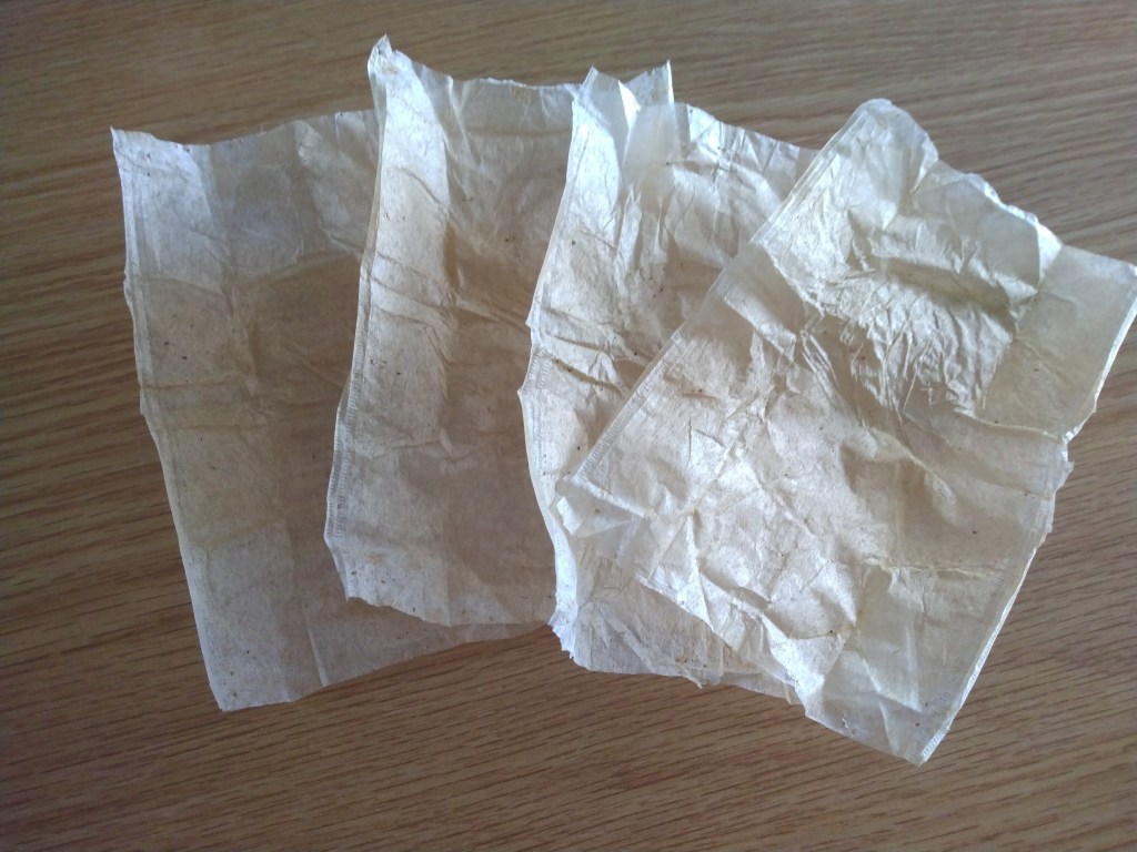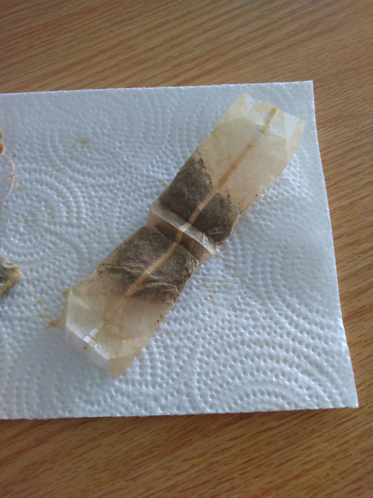 Once you’ve drunk your tea, take your teabag over to a sink and squeeze out as much excess moisture as you can. Be careful not to squish or wrinkle the bag too much. I usually place the bag on the heel of one palm, and press flat with the other palm. Then, lay your bag on a paper towel and leave it to dry for a few days.